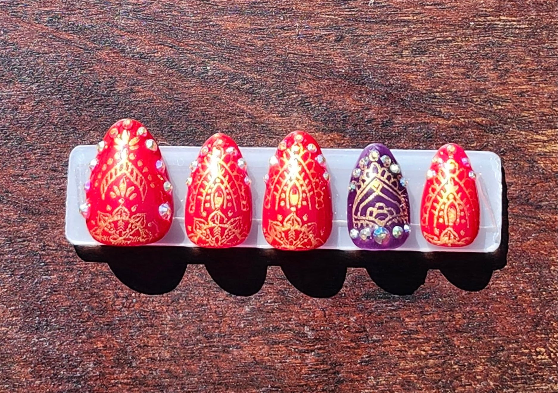 Autumn Bollywood : Featuring rich, bold colors and shimmering rhinestone accents, this design captures the luxurious spirit of traditional Indian aesthetics. Perfect for those seeking intricate detailing with a striking palette, to elevate your nail game with elegance and flair.