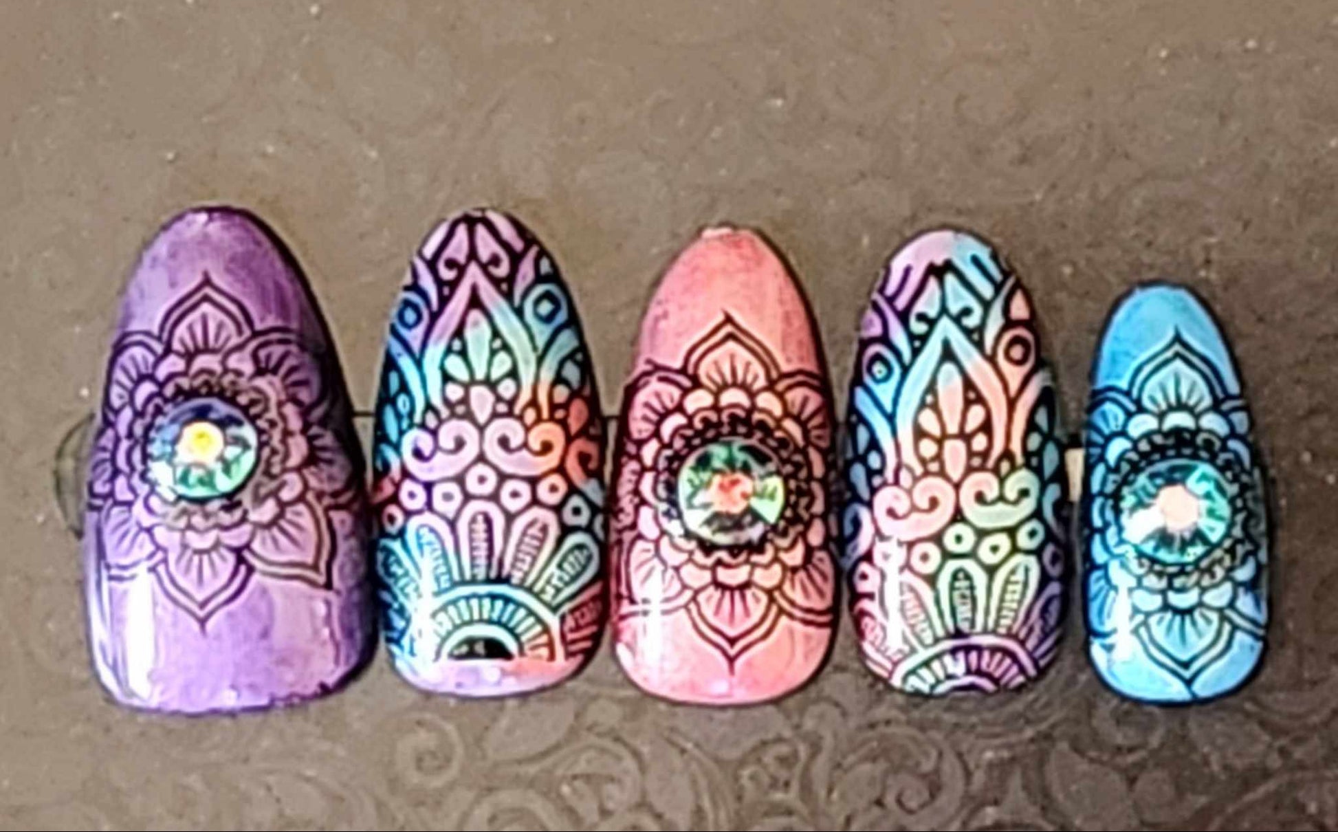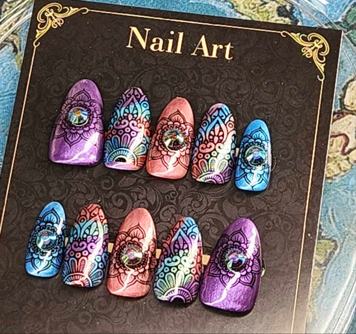 Elevate your nail art with the Bright Watercolors Mehndi set, featuring vivid, colorful watercolor designs inspired by traditional mehndi patterns. Each nail showcases intricate mandala motifs accented with sparkling rhinestones, blending artistry and elegance. Ready-made for convenience, this collection offers a professional touch to enhance your look with bold, detailed charm.