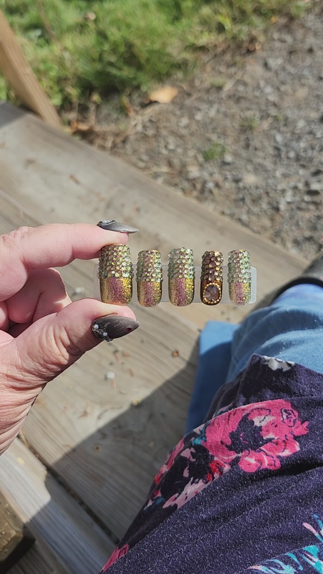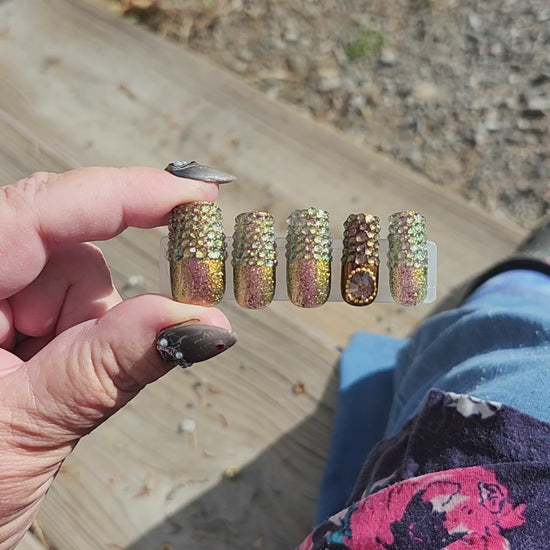 Chameleon Bling—a dazzling fusion of glitter, rhinestones, and iridescent chameleon hues. This design captures light from every angle, creating a mesmerizing, color-shifting effect that adds sophisticated sparkle and depth. Perfect for anyone seeking a luxurious, eye-catching finish that transforms with every movement.
