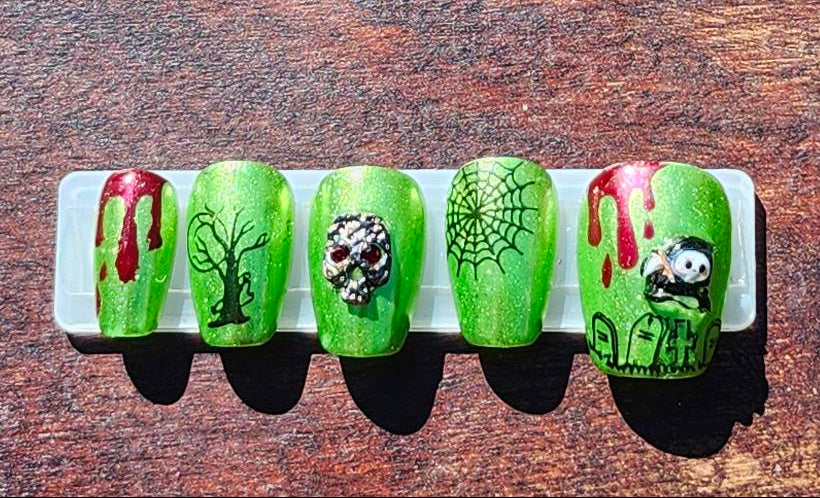 Embrace the spirit of Halloween with Chrome Poison, featuring a striking lime green chrome base that captures attention with its vibrant shimmer. This design includes a cute yet spooky 3D reaper accent, and a shiny, metal skull with red gem eyes, perfectly balancing eerie charm and playful elegance. Ideal for adding a unique finish to your seasonal nail art collection.