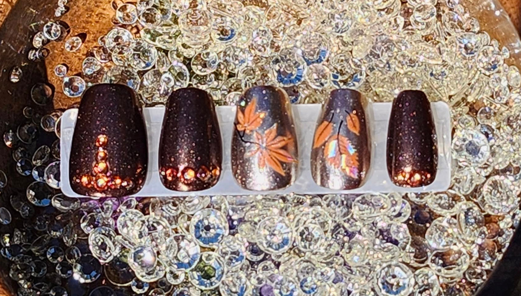 Capture the essence of autumn with the Falling Leaves nail design. Featuring an earthy, glossy brown base accented by shimmering gold chrome and vibrant orange, this look beautifully balances warm tones. Rhinestones add a touch of sparkle, while holographic leaves create a dynamic, dimensional effect that reflects light from every angle. Perfect for those seeking a refined yet festive style inspired by the changing season.