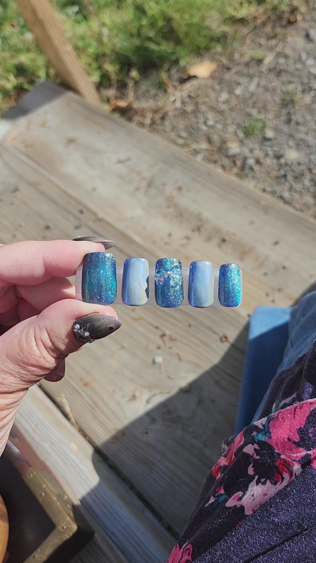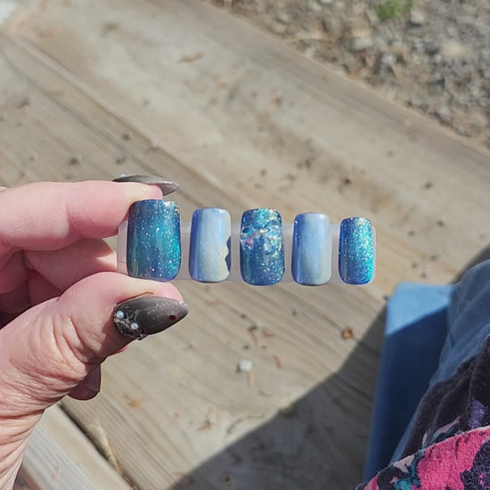 Experience the captivating beauty of simulated moonstone and labradorite, featuring a shimmering surface that shifts with every movement. This elegant design showcases layers of white, blue, and subtle, golden glitter that catches the light, enhanced by an iridescent 3D bow accent. Ideal for those who appreciate sophisticated, dynamic nail art with depth and luminosity.