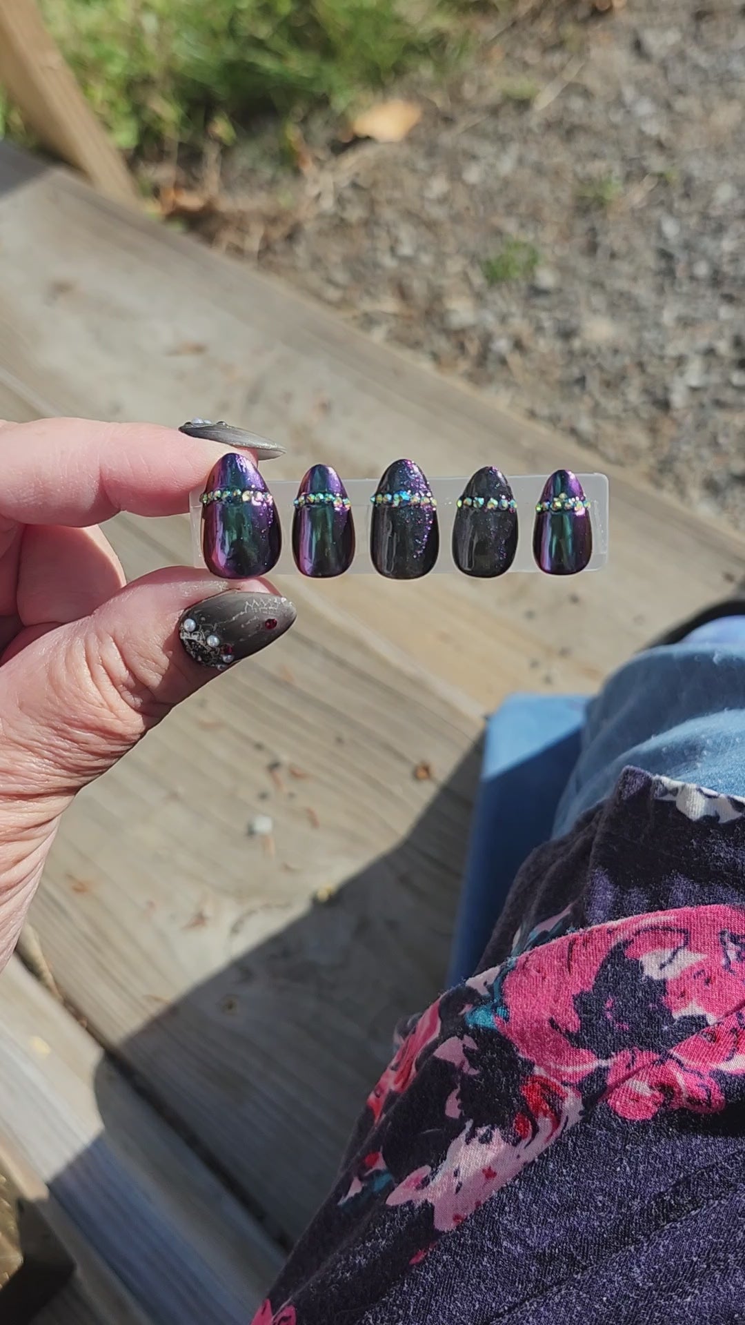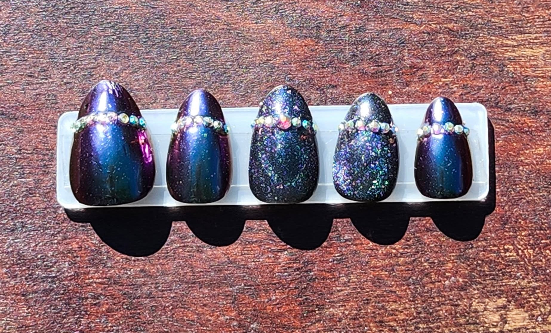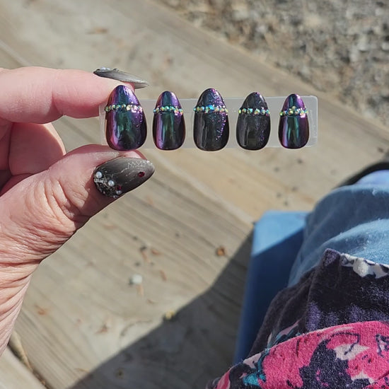 Magnet & Steel combines deep purple and vibrant teal shades with chrome and cat's eye effects to create a dynamic nail art look. Enhanced with chameleon glitter and precisely placed rhinestones, this set offers a bold, sophisticated design, with captivating depth and shine.
