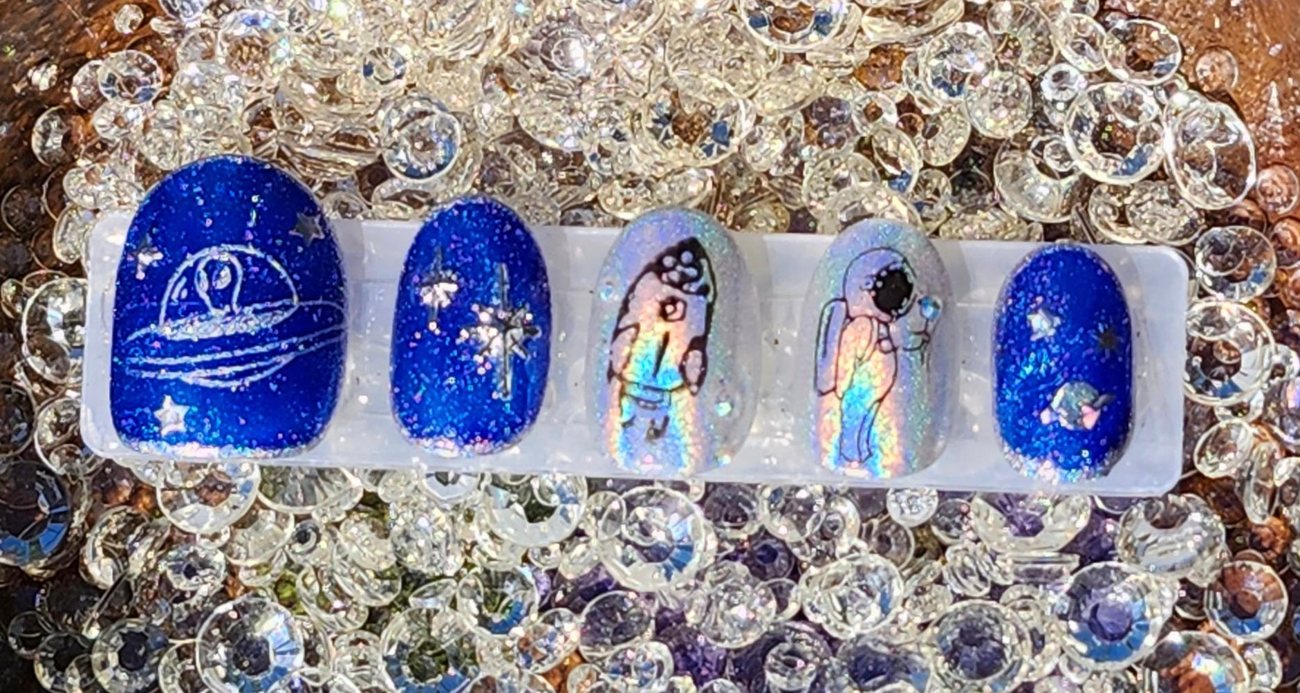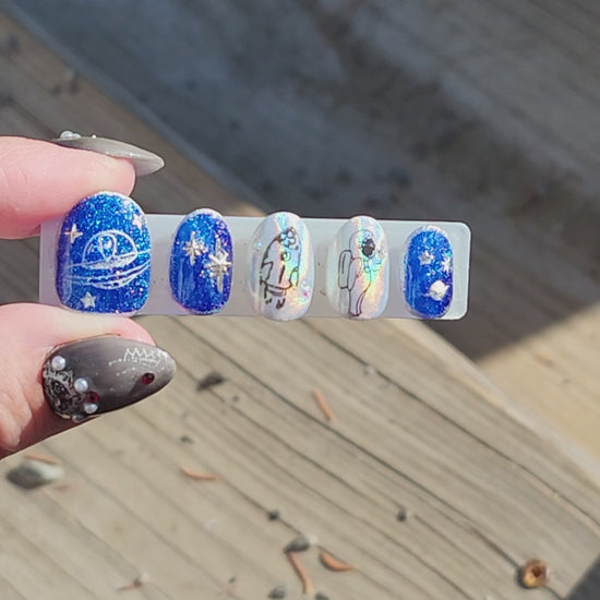 Major Tom offers a striking blend of space-inspired design with a holographic chrome sheen that captures the mystery of the cosmos. Featuring motifs of UFOs, aliens, stars, and astronauts in a captivating blue chrome finish, this product delivers an aesthetic perfect for those passionate about celestial themes. Its reflective surface enhances every detail, making it a standout choice for a futuristic, otherworldly look.