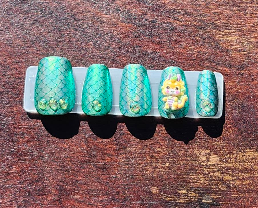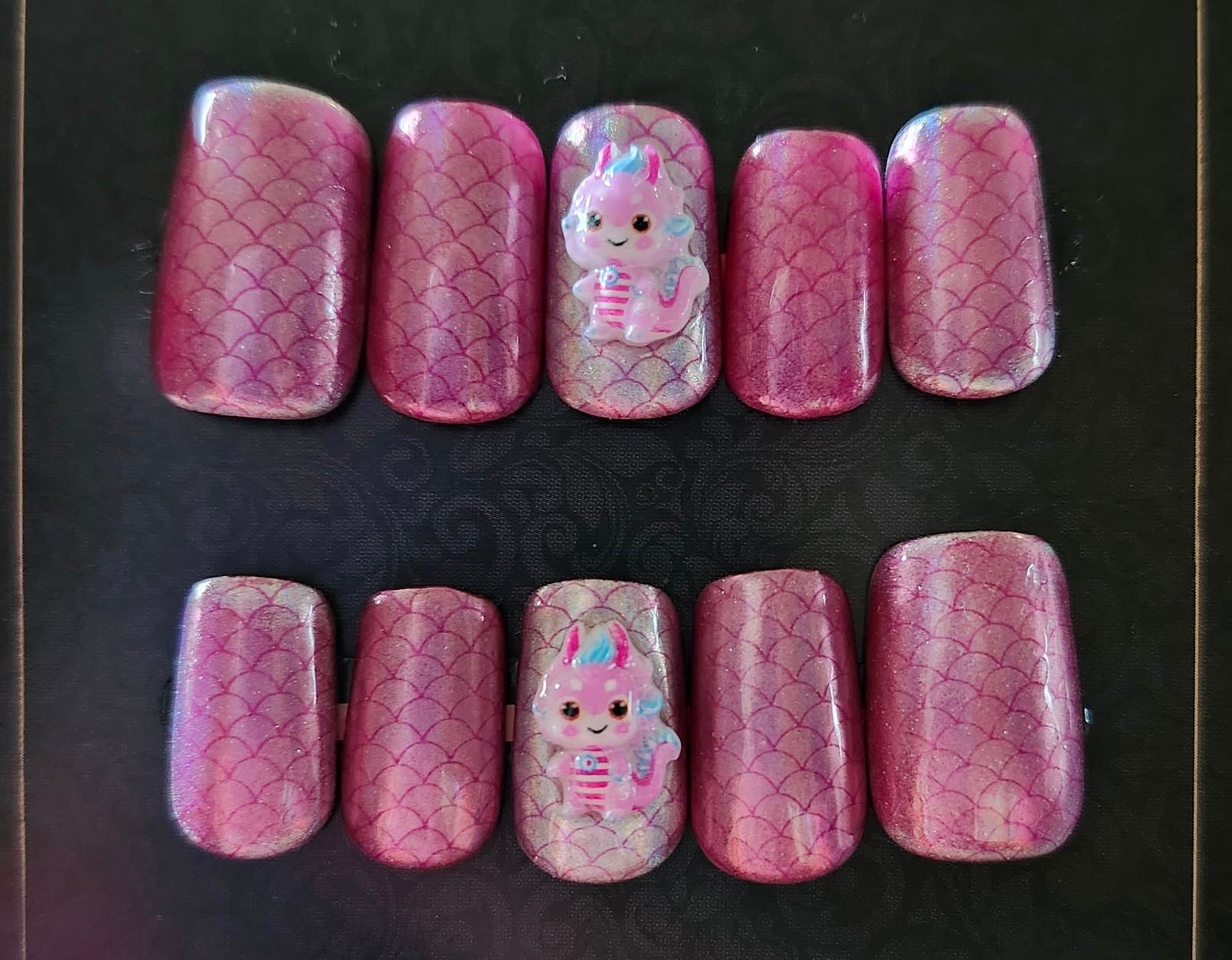 This Baby Dragon nail art set features a vibrant pink chrome finish that highlights its whimsical 3D charm. This mythical creature captures the luster and playfulness of a baby dragon, adding a cute yet sophisticated element to your nails. Perfect for those seeking a unique, fantasy-inspired manicure, with a contemporary, metallic sheen.
