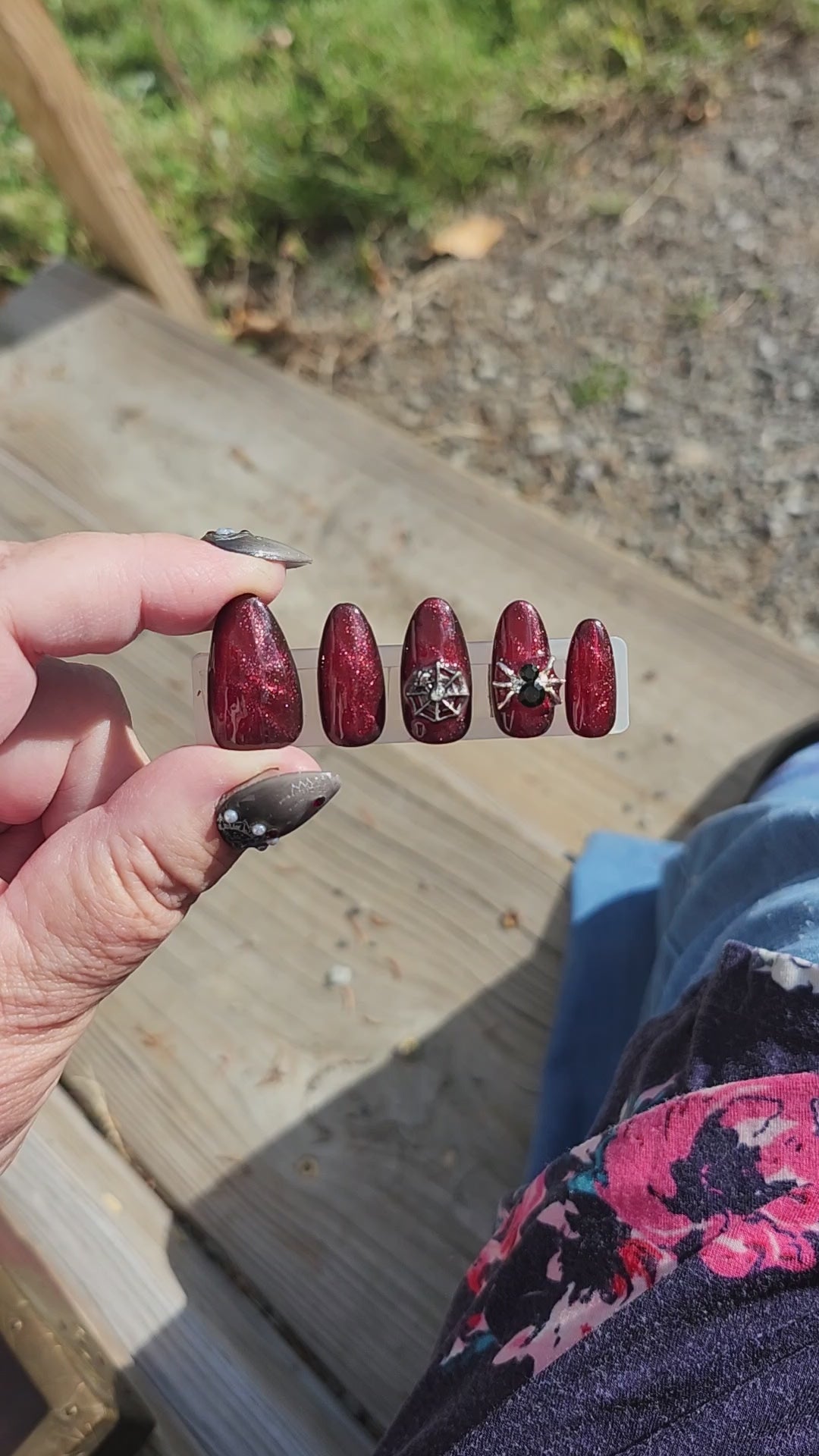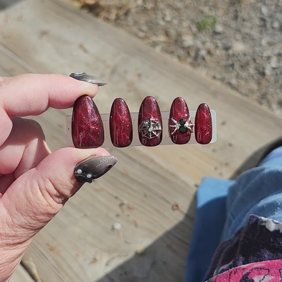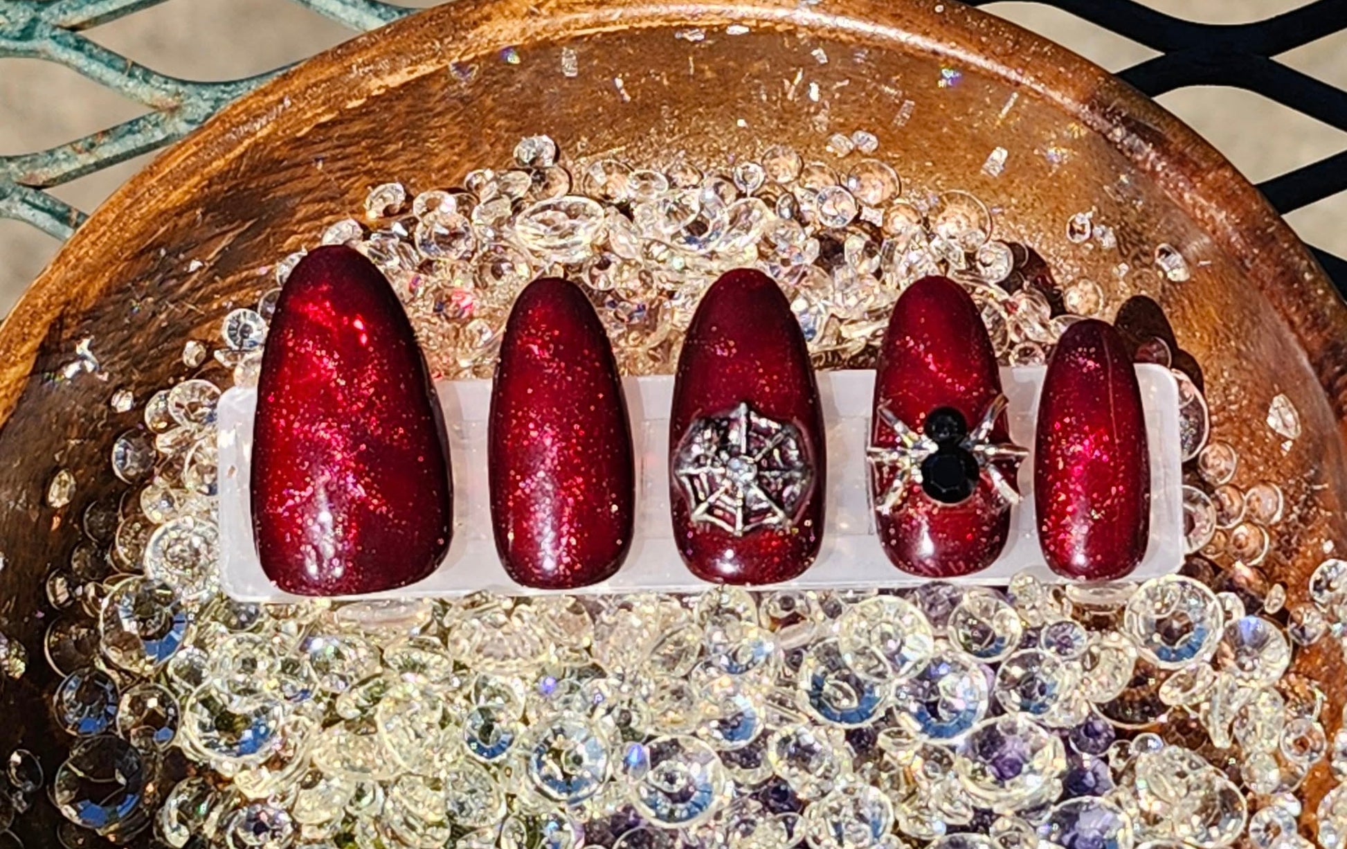 Showcase bold elegance with this Red Spider Web nail art design featuring a striking red, starburst, magnetic finish and sophisticated black ombre edging. Enhanced by a 3D metal spiderweb and black, rhinestone spider accent. This sexy-spooky Halloween set delivers a captivating statement for your nails.